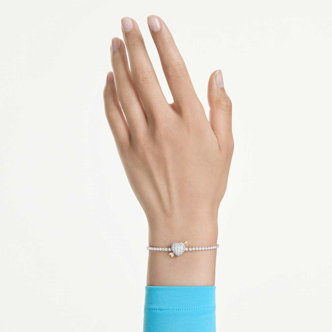 Il vero amore incontra una radiosa luce nel bracciale Swarovski della famiglia Idyllia. La morbida catena è impreziosita da cristalli taglio Round in una montatura placcata rodio, mentre al centro, un scintillante motivo a cuore è trafitto dalla freccia di Cupido in tonalità oro. Adatta la vestibilità alla tua misura utilizzando la chiusura scorrevole e abbina il bracciale ad altri gioielli coordinati della stessa collezione ispirata al romanticismo.