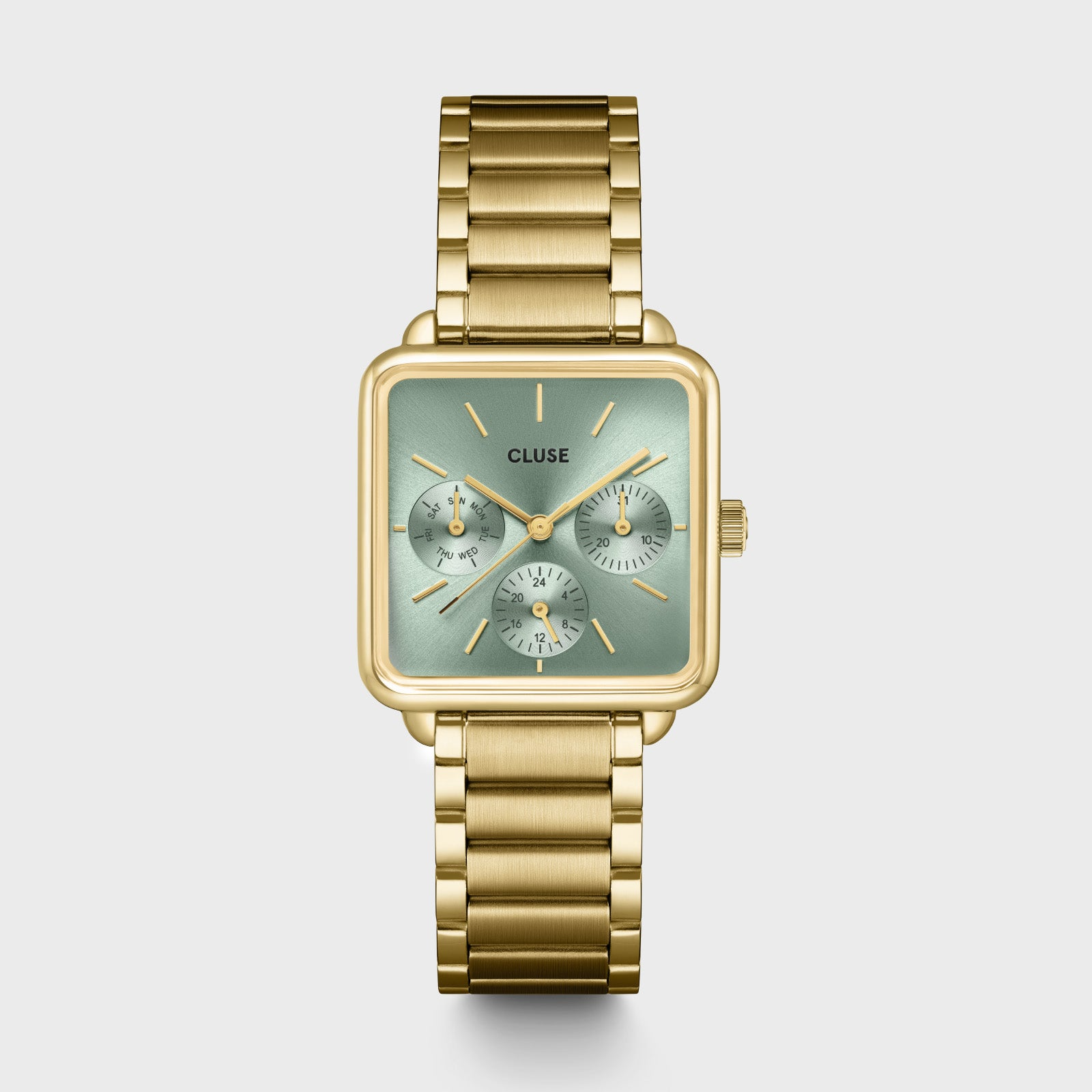 L'orologio quadrato La Tétragone Multifunction da donna presenta una cassa color oro da 30 mm, un quadrante verde salvia e un cinturino color oro a 3 maglie da 16 mm in acciaio inossidabile.