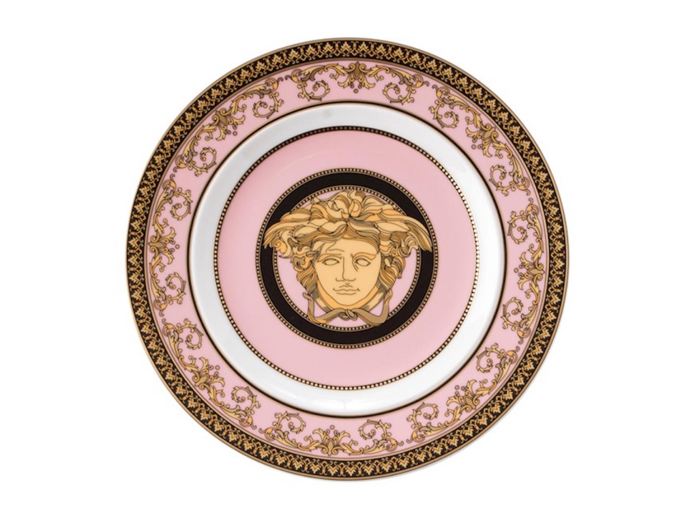 Piatto segnaposto di Versace della collezione medusa amplified. 18 cm in porcellana di forma rotonda di colore rosa.