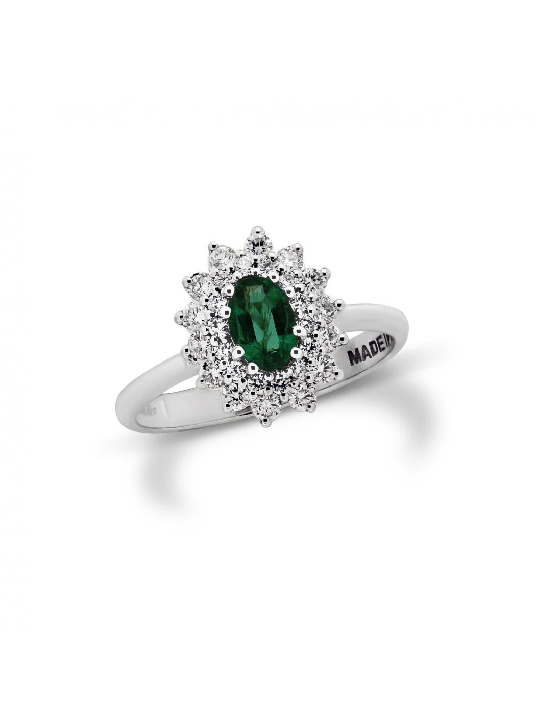 Anello in oro bianco 18 kt (3,20g), diamanti taglio brillante ct. 0,44 F/VS e smeraldo centrale ct. 0,43.
