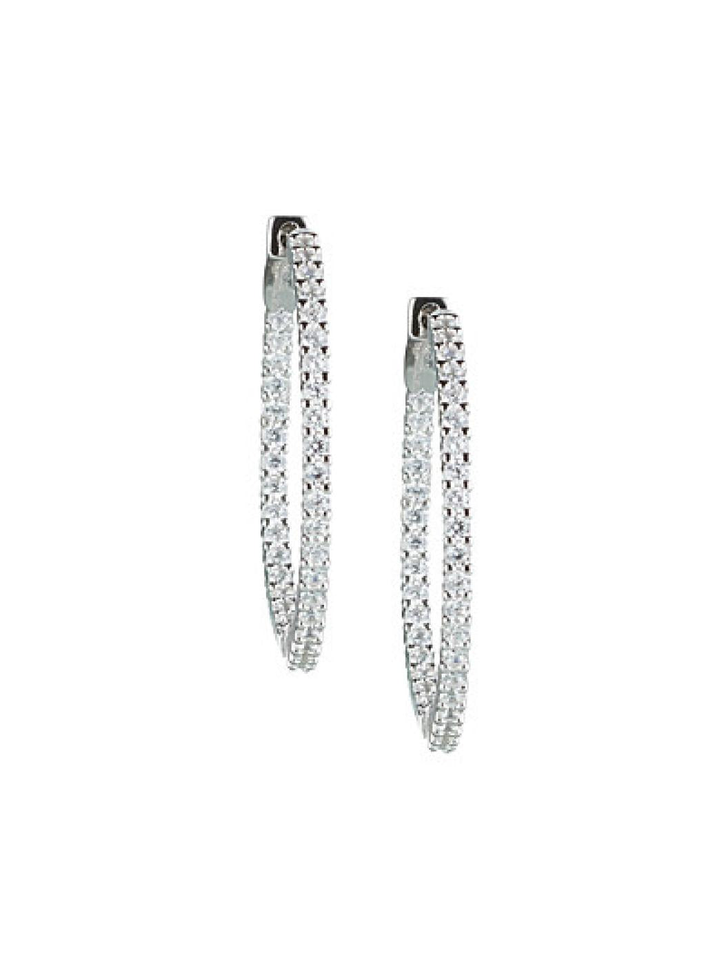 Orecchini da donna a cerchio realizzati in argento 925 con zirconia cubica. Diametro pietre 1,5 mm. Diametro cerchio: cm 3. La chiusura è con gancio.