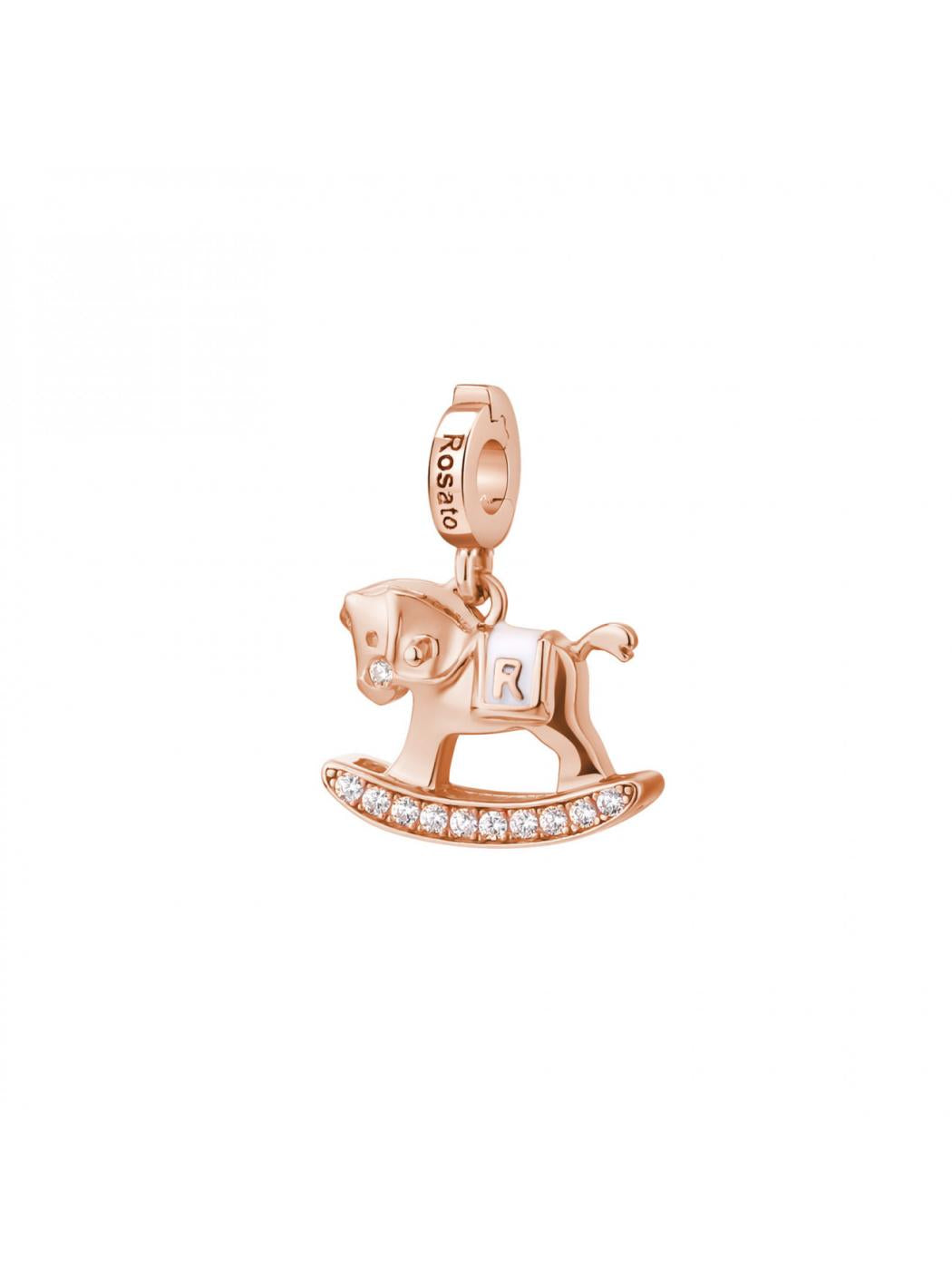 Charm in argento 925‰, galvanica oro rosa, smalto bianco, 22 cubic zirconia bianchi. Misura: 16mm.Significato: GIOCO.