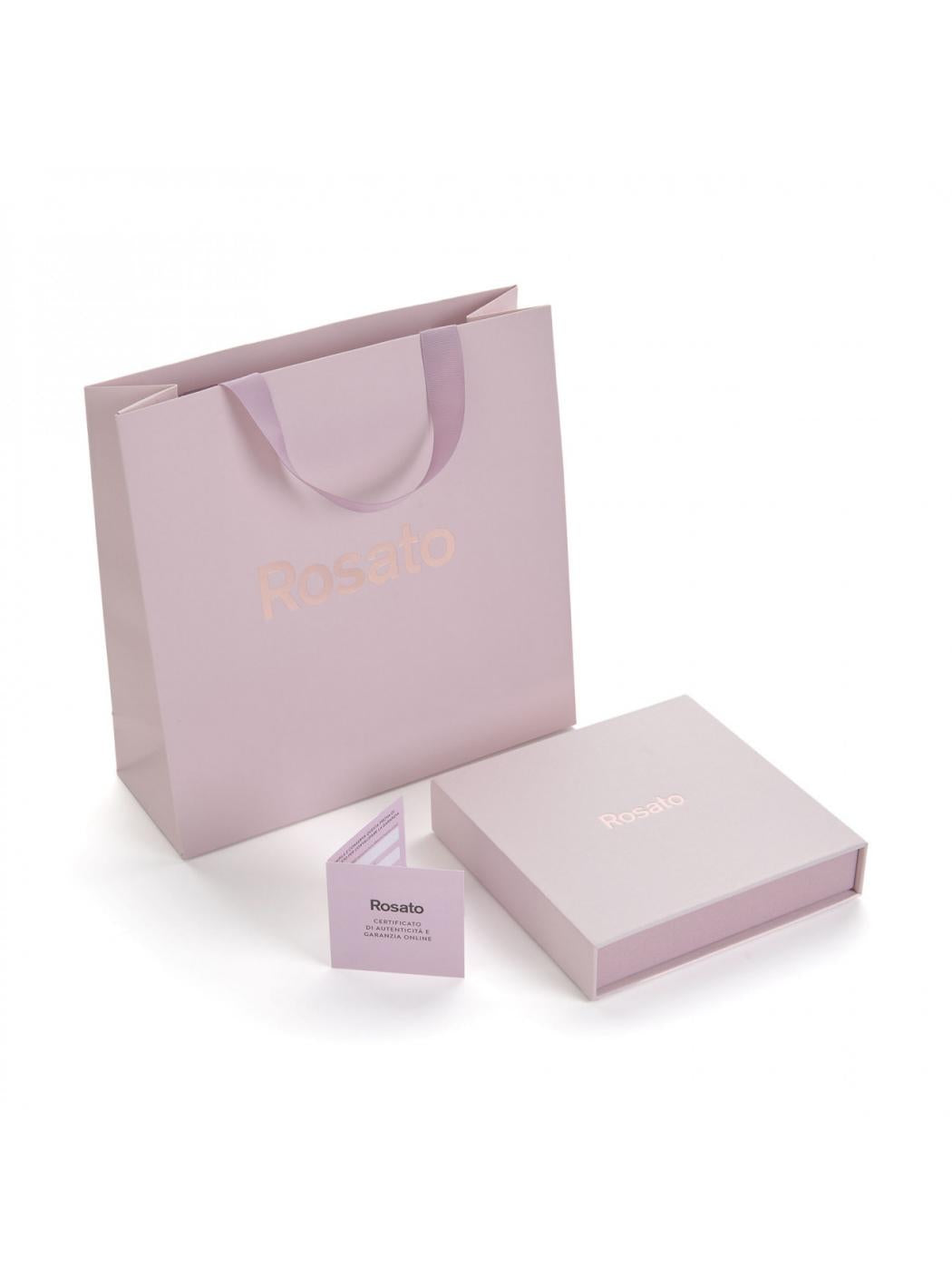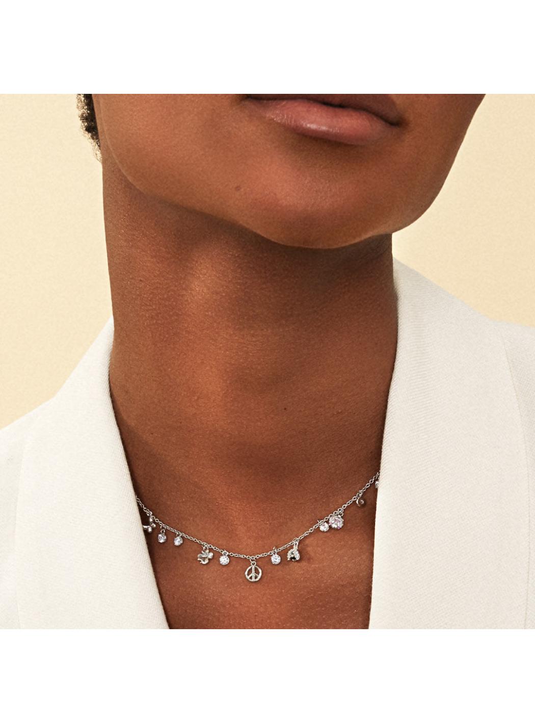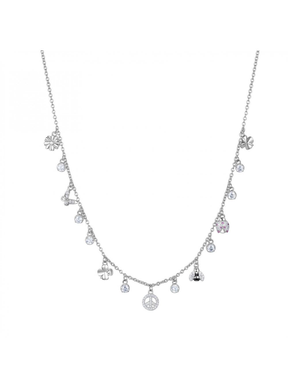 Collana in argento 925‰ con pendenti a forma di fiore, farfalla, quadrifoglio, simbolo della pace, ape e coccinella, 74 cubic zirconia bianchi e 7 cubic zirconia rossi.