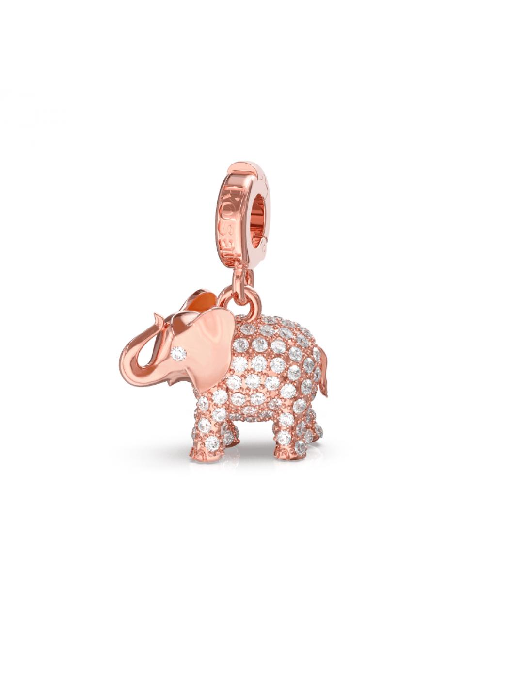 Ciondolo Charm Elefante in edizione limitata della collezione Pink is Good di Rosato Gioielli, un progetto in collaborazione con la fondazione Umberto Veronesi dedicato al sostegno della ricerca scientifica sui tumori femminili e alla promozione della prevenzione di queste patologie. E’ realizzato in argento 925/000 con galvanica oro rosa, impreziosita da zirconi bianchi. Anello di aggancio con apertura a scomparsa. Il ciondolo è compatibile con tutti i supporti della collezione Stories di Rosato. Significato: FORZA.
