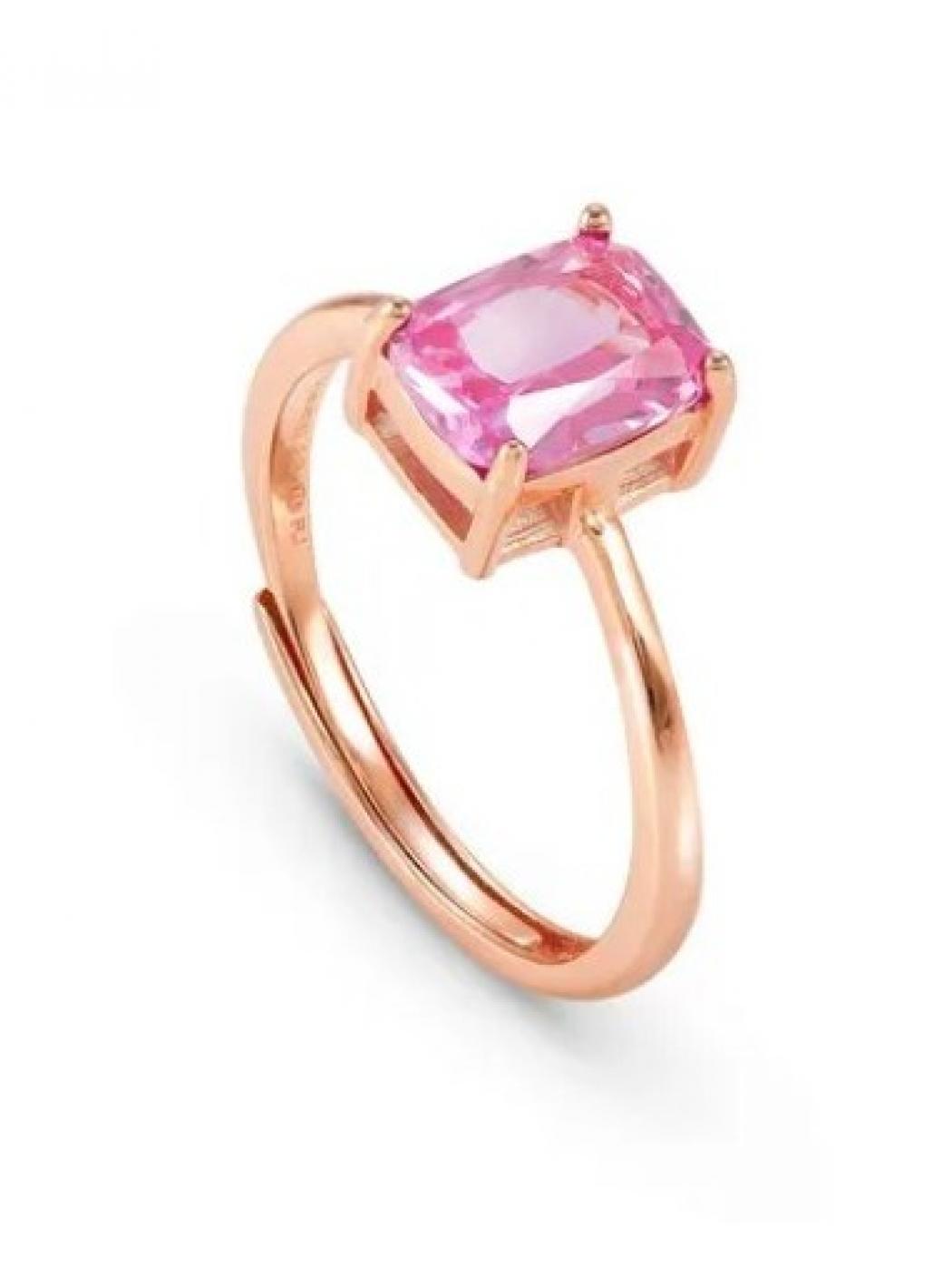 Anello in Argento 925 con Cubic Zirconia rettangolare rosa. Rivestimento superficiale in Oro Rosa 916 realizzato mediante bagno galvanico. Anello misura regolabile. Misura pietra: 0,6x0,8cm.