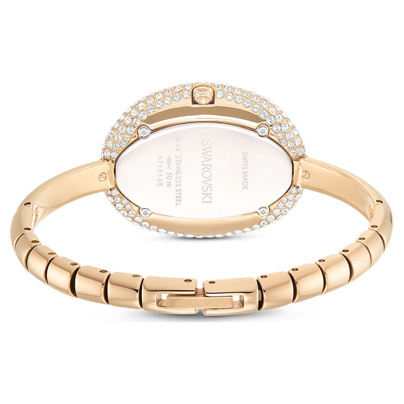 Giocando con le proporzioni, l’orologio Imber Bangle offre una silhouette straordinaria in acciaio inossidabile con finitura in tonalità oro champagne. La sua cassa di forma ovale presenta una lunetta impreziosita da circa 321 cristalli, che incornicia luminosa il quadrante con motivo sunray dell'orologio. Al polso, un bangle sottile e regolabile garantisce comfort e stile in ogni momento. L’orologio Swiss Made è resistente all'acqua fino a 50 metri e si abbina perfettamente ai gioielli Imber di Swarovski.