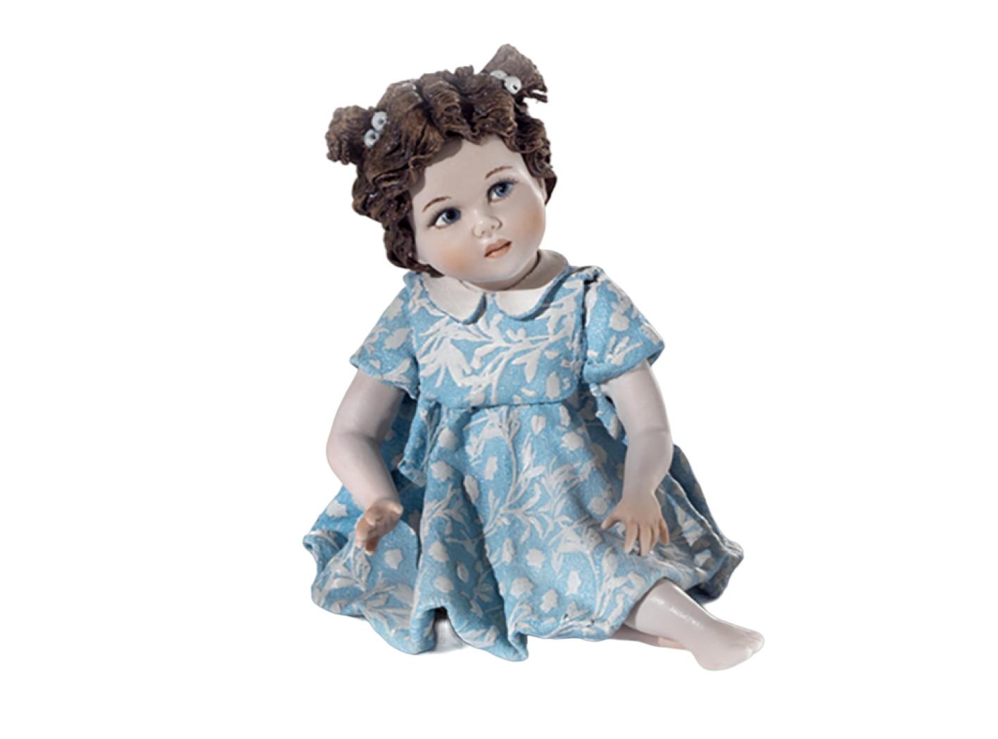 Figura in porcellana raffigurante una bimba in un abito azzurro con decori bianchi in rilievo, dalle maniche corte e colletto bianco. Siede con le gambe di lato e porta i capelli legati in due alte codine fermate da due ponpon azzurri.Altezza: 15 cm.Materiale: Porcellana Vicentina.