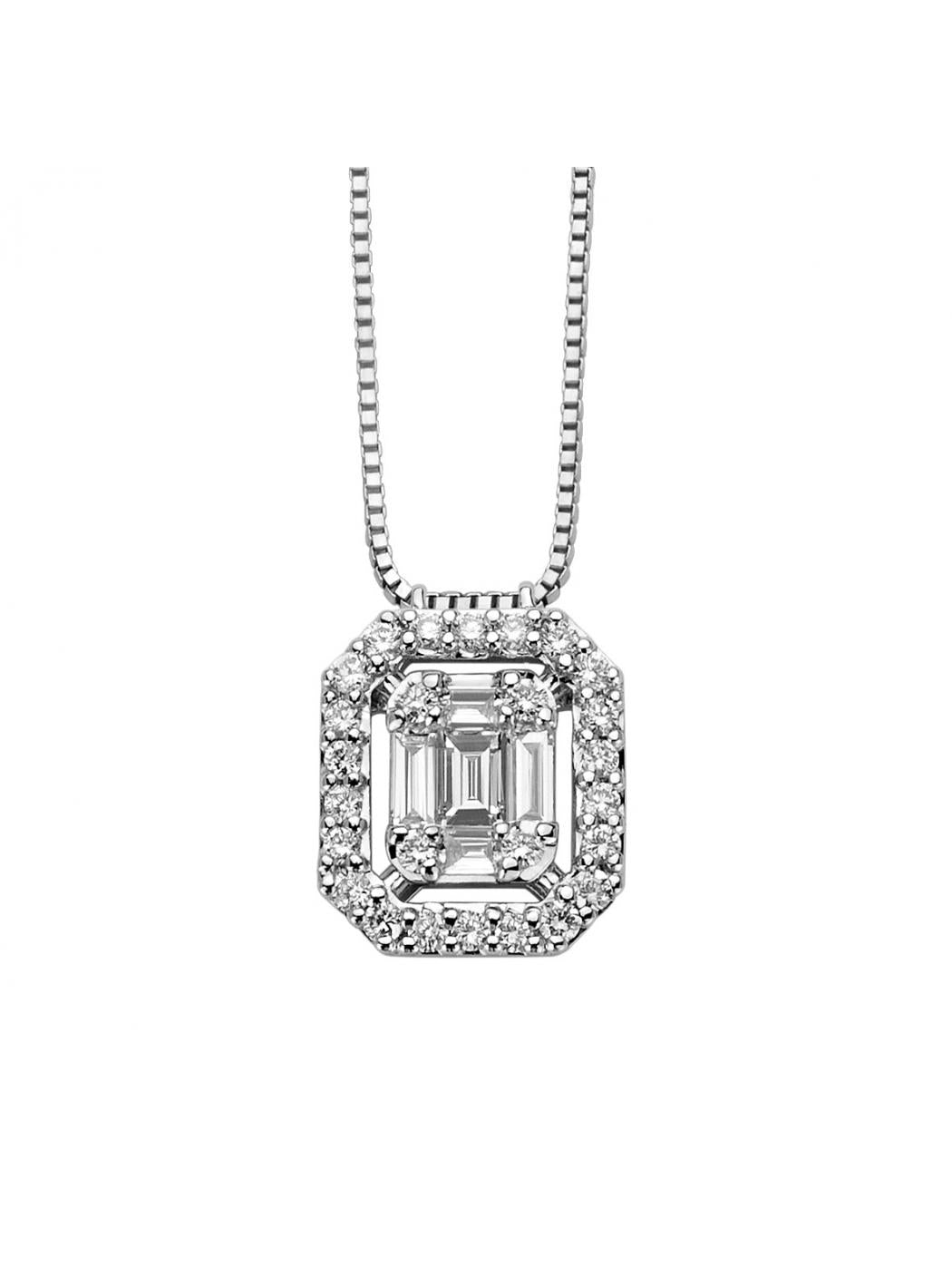 Pendente Fascino in oro bianco 18 kt e diamanti 0,20 ct, G-VS.Una linea classica rivisitata in chiave moderna, che racchiude nelle forme e nelle montature raffinate tutta la bellezza del gioiello ricco di fascino.