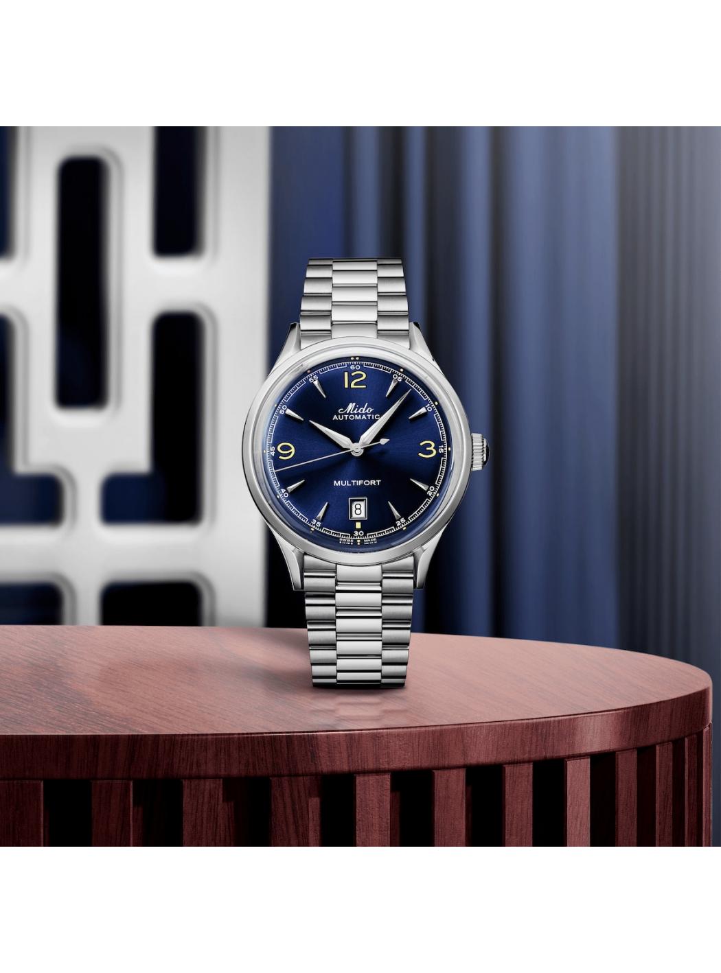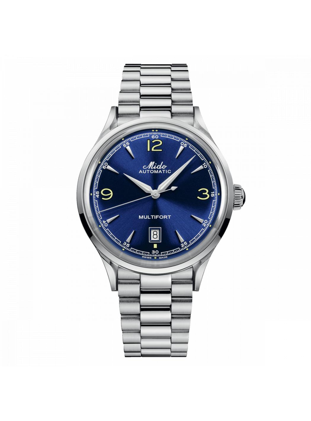 Con il suo look retrò e l'estrema affidabilità, il Multifort Powerwind rende un elegante omaggio all'esperienza di MIDO. Nel 1954 viene prodotto per la prima volta il movimento Powerwind, dando vita al rivoluzionario modello che porta il suo nome. All'epoca, questo movimento automatico è il più preciso e affidabile di MIDOs e rappresenta una grande evoluzione. È con questa stessa ambizione che MIDO continua a dotare l'orologio svizzero Multifort Powerwind di un'alta tecnologia che permette di offrire un cronometraggio di affidabilità e precisione senza pari, come in passato.Peso (g): 120Impermeabilità: 5 bar (50 m / 165 ft)Forma della cassa: RotondoLunghezza (mm): 40.00Larghezza (mm): 40.00Spessore medio (mm): 12.1Anse (mm): 19.00Materiale della cassa: Acciaio inossidabileVetro: Vetro zaffiroOpzioni della cassa: Cassa con Fondello a vistaColore del quadrante: BluIndici: Indici applicati / Numeri arabiFunzioni: Data, GiornoRiserva di carica: Riserva di carica pari a 80 oreMovimento: Mido automatico ETADettagli del cinturino: Acciaio inossidabileColore cinturino: GrigioFibbia: Chiusura deployante.