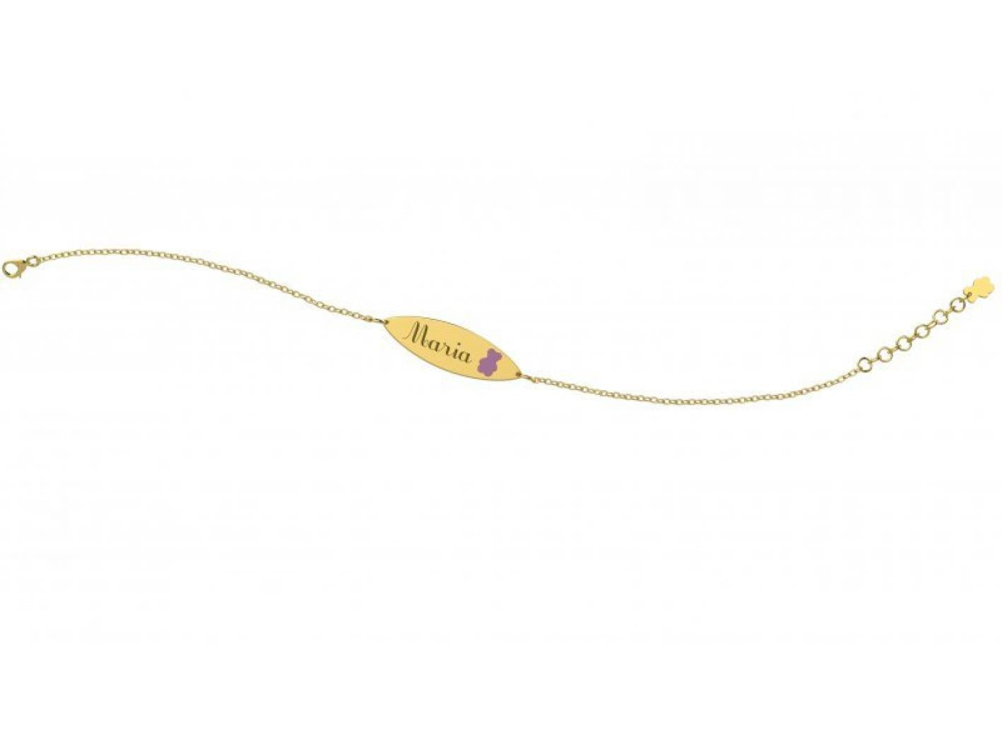 Delizioso bracciale in oro 9 carati composto da una dolce targhetta impreziosita da tenero orsetto lilla verniciato. Misure: 13-15 cm.